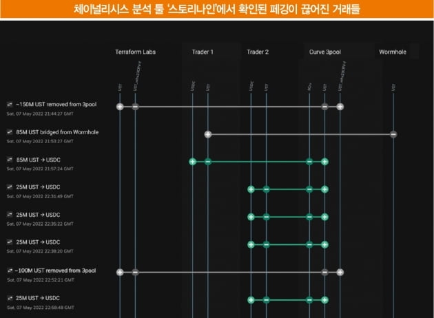페깅을 조정하고 커브 3풀의 균형을 맞추기 위해 5월 7일부터 9일까지 익명의 테라 지지자 3명이 총 4억 8000만 USDT를 테라로 교환했다.