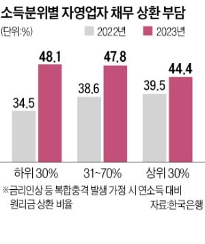 특히 저소득 자영업 가구를 중심으로 채무 부담이 급격하게 늘어날 것으로 예상된다. 하위 30% 저소득 자영업 가구의 DSR은 올해 34.5%에서 내년 48.1%로 13.6%포인트 급증하는 것으로 나타났다. 중소득 가구(38.6%→47.8%)와 상위 30% 고소득 가구(39.5%→44.4%)의 DSR 증가 폭과 비교하면 더욱 두드러진다. 저소득 자영업자의 대출 부실이 심화하면 이들에 대한 대출 비중이 높은 제2금융권의 연쇄 부실도 우려된다.