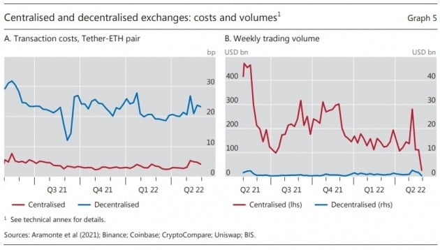 BIS는 '법정화폐의 대안'을 자처해온 암호화폐가 그 핵심인 탈중앙화 내러티브와는 달리 규제 밖에 있는 중앙화된 중개인에게 의존하고 있다고도 했다. 이용자가 예치한 코인에 대한 통제권을 쥔 중앙화된 암호화폐거래소에 거래가 몰리는가 하면, 거버넌스 토큰 보유자들의 투표로 주요 결정이 이뤄지는 디파이 생태계 등의 모순을 지적한 것이다.