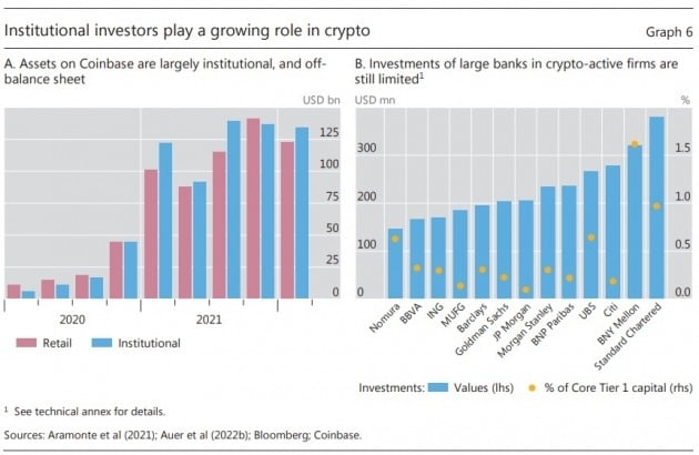 헤지펀드나 투자자문사 같은 비은행 투자자들은 이미 암호화폐 시장의 큰손으로 떠올랐다. BIS에 따르면 올 1분기 기준 미국 최대 암호화폐거래소인 코인베이스의 자산 가운데 기관투자자 보유분은 1340억달러(약 174조3200억원)에 달했다. 2020년 1분기 60억달러(약 7조8000억원)에서 22배로 폭증했다. 개인투자자 자산은 같은 기간 11배 증가한 1230억달러(약 160조원)였다.