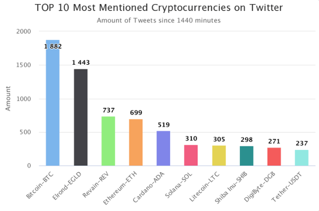 4위~10위에는 이더리움(ETH, 699회), 카르다노(ADA, 519회), 솔라나(SOL, 310회), 라이트코인(LTC, 305회), 시바이누(SHIB, 298회), 디지바이트(DGB, 271회), 테더(USDT, 237회) 등이 이름을 올렸다.