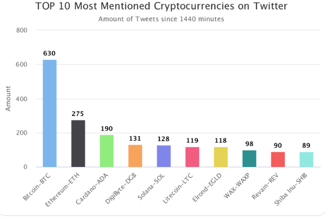 4위~10위에는 디지바이트(DGB, 131회), 솔라나(SOL, 128회), 라이트코인(LTC, 119회), 엘론드(EGLD, 118회), 왁스(WAXP, 98회), 레바인(REV, 90회), 시바이누(SHIB, 89회) 등이 이름을 올렸다.