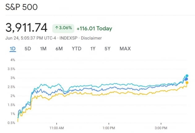 이런 분위기가 이어지면서 24일(미 동부 시간) 뉴욕 시장의 주요 지수는 0.5~1% 수준의 상승세로 출발했습니다. 그리고 30분 뒤인 오전 10시 지수는 폭등했습니다. 나스닥은 거의 3% 수준까지 수직으로 상승했습니다.