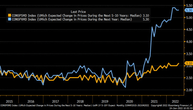 3.3%까지 치솟으면서 Fed를 놀라게 했던 미시간대의 6월 장기(5~10년) 인플레이션 기대치가 3.1%로 0.2%포인트 하향 조정되어 발표된 것입니다. 이는 제롬 파월 의장이 "꽤 눈길을 끌었다"(quite eye-catching)라며 6월 연방공개시장위원회(FOMC)에서 50bp 대신 75bp 인상한 배경으로 꼽았던 수치입니다.