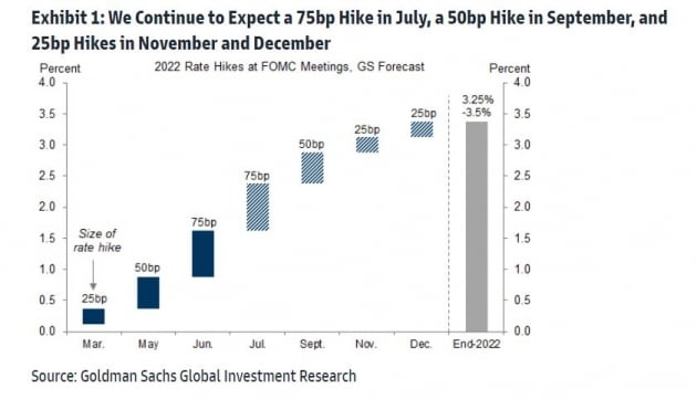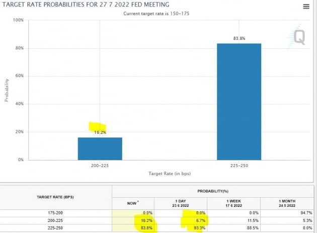 이랬던 수치가 다시 최근 10개월 평균 범위 이내에 머무른 것으로 밝혀진 것이죠. 월가에서는 "5월 75bp 인상을 되돌려야 하는 것 아니냐"라는 농담도 나왔습니다. 언스트앤드영의 그레고리 다코 이코노미스트는 "예비치를 정책에 활용하면 잘못될 위험이 있다"라고 지적했습니다. 상황이 이렇다면 7월 FOMC에서 75bp를 인상할 필요성이 감소하게 됩니다. 실제 시카고선물거래소(CME)의 Fed 워치 시장에서는 7월 75bp 인상 베팅이 전날 93.3%에서 이날 83.8%로 감소하고, 대신 50bp 인상 베팅이 16.2%(전날 6.7%)로 증가했습니다.