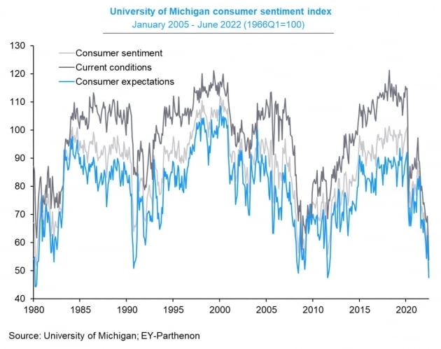 미시간대의 6월 소비자태도지수는 50.0으로 예비치(50.2)보다 더 낮아졌습니다. 5월(58.4)보다 급감한 것으로 1987년 조사가 시작된 뒤 가장 낮은 수치입니다. 수 교수는 "소비자의 약 79%는 비즈니스 상황이 2009년 이후 가장 나쁜 시기를 예상했다. 인플레이션은 계속 소비자에게 가장 중요한 관심사였다. 소비자의 47%는 생활 수준을 잠식하는 인플레이션을 자신감 하락의 이유로 꼽았다"라고 설명했습니다.