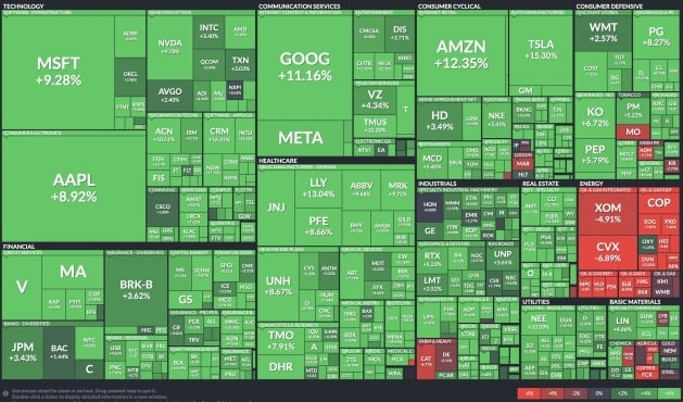 카니발(12.44%)이 최근 분기 예약량이 팬데믹 이후 최고에 달하고 있다고 발표한 뒤 로열캐리비안(15.77%) 노르웨이지안크루즈(15.36%) 등 크루즈 주식과 아메리칸항공(7.09%), 엑스피디아(8.85%) 등 여행 주식들이 모두 폭등했습니다. 어제 Fed의 연례 '스트레스 테스트'를 통과한 웰스파고(7.75%) 골드만삭스(5.79%) 등 금융주도 급등했습니다. 더 높은 배송비를 받겠다며 2023년 실적 가이던스를 높인 페덱스는 7.16% 올랐습니다.