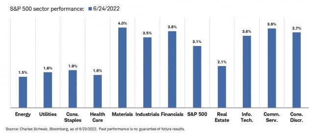 주요 지수가 크게 오른 것은 전날과 비슷하지만, 내부 업종별로 보면 반대 현상이 벌어졌습니다. S&P500 지수 11개 업종이 모두 오른 가운데 전날과 달리 소재(3.98%) 금융(3.80%) 등 경기민감주가 큰 폭으로 상승하고, 헬스케어(1.63%) 유틸리티(1.76%) 등 경기방어주가 상대적으로 처졌습니다.