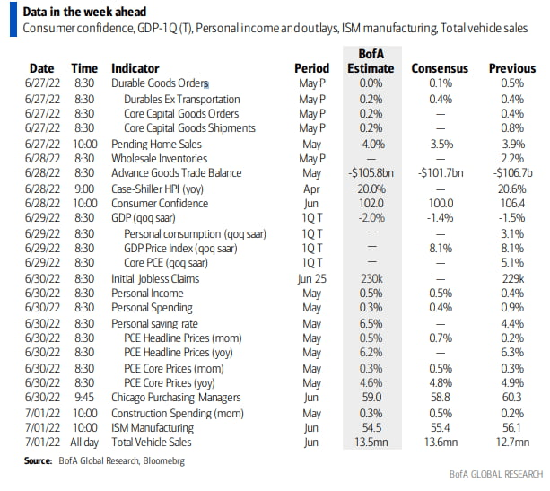 다음 주 가장 중요한 지표는 6월 개인소비지출(PCE) 물가일 것입니다. 뱅크오브아메리카는 헤드라인 수치가 6.2% 상승으로 5월 6.3% 상승보다 둔화할 것으로 봅니다. 근원 수치도 4.6%로 5월 4.9%에 비해 감소할 것으로 예상합니다. 이는 PCE 물가와 CPI 물가의 계산법이 다르기 때문입니다. PCE 물가는 CPI 상승에 큰 몫을 차지한 항공료가 별로 반영되지 않으며, 주거비 비중도 CPI의 33%에 비해 16%에 불과합니다. 또 의료비 비중도 차이가 납니다. 이 때문에 '인플레이션 정점' 주장이 강화될 수 있습니다. 다만 전월 대비 수치는 헤드라인 0.5%, 근원 0.3%로 5월(0.2%, 0.3%)보다는 상승 폭이 커질 것으로 뱅크오브아메리카는 예상합니다.