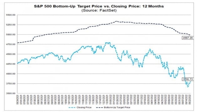 최근 애널리스트 시각도 조금씩 하향 조정되고 있습니다. 팩트셋에 따르면 월가 애널리스트들이 제시한 종목별 목표 가격을 합산해 상향식으로 계산한 S&P500 지수의 목표가가 6월 23일 기준 4987.28로 올해 처음으로 5000 아래로 떨어졌습니다. 지난 1월 20일 정점이던 5344.26에서 7% 하락한 것입니다. 팩트셋은 "이는 23일 S&P500 지수 종가 3,795.73보다 여전히 31.4% 높다는 점에 유의해야 한다"면서 "최근 상향식 목표 주가가 하락했음에도 불구하고 애널리스트들은 여전히 지수의 가치가 향후 12개월 동안 30% 이상 증가할 것으로 믿고 있는 것"이라고 설명했습니다.