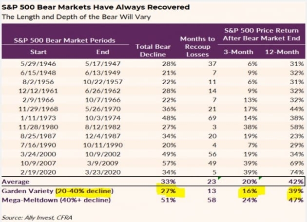 그런데 1946년 이후 13번의 베어마켓을 분석해보면 40% 이상 떨어졌던 3번을 제외한 10번의 평균 하락률은 27%에 그쳤다는 것입니다. 그런 뒤 바닥을 치면 3개월 만에 16%, 1년 만에 39% 상승했습니다. 기간으로 따져도 대규모 하락장은 2년 이상 약세장을 겪었지만, 얕은 베어마켓은 평균 11개월 정도 지속했습니다. 벨 전략가는 "Fed의 긴축, 공급망 혼란 완화 등이 인플레이션을 낮추는 데 도움이 된다면 경기 침체보다는 둔화, 혹은 마일드한 침체가 발생할 수 있다"라면서 "이런 시나리오에서는 얕은 베어마켓일 가능성이 크다"라고 설명했습니다. 그는 "이번 약세장이 벌써 6개월이 지났다는 점을 고려하면 벌써 베어마켓이 절반 이상 지나갔을 수 있다"라고 덧붙였습니다.