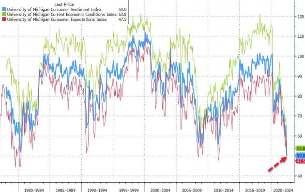 실제 경기는 둔화할 조짐을 보이고 있습니다. 미시간대가 동시에 내놓은 6월 소비자태도지수는 50.0으로 확정됐습니다. 예비치와 월스트리트저널이 집계한 시장 전망치 평균(50.2)을 밑도는 수치입니다. 역대 최저치입니다.