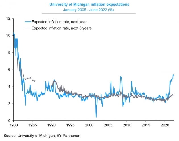 파월 의장은 장기 인플레이션 기대를 통제하는 게 중요하다는 점을 여러 차례 강조해왔다. 그는 지난 FOMC 직후 기자회견에서 미시간대 인플레이션 기대와 다른 물가 데이터가 50bp가 아닌 75bp를 인상하기로 하는 데 영향을 줬다고 밝혔다. 그는 "인플레이션 기대 상승이 매우 눈길을 끈다"면서 중앙은행이 장기 인플레이션 기대치를 묶어놓는 게 얼마나 중요한지를 설명했다. 다만 그는 잠정치가 바뀔 수 있다고 덧붙이기도 했다.