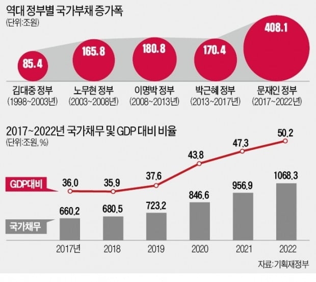 김 교수는 "문 대통령은 2019년 5월 홍남기 당시 부총리 겸 기획재정부 장관이 국가채무비율을 40%대 초반에서 운용하겠다는 발언에 대해 유럽연합(EU)의 사례를 들며 반대했는데, 이후 국가채무비율 관리는 사실상 불가능하게 됐다"고 꼬집었다. 그러면서 "재정의 공유재 문제가 발생하면 재정여력은 급속도로 고갈되고, 국가채무비율은 국가신용을 훼손하는 지경에 이를 수 있다"고 했다.