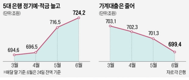 28일 은행권에 따르면 국민 신한 하나 우리 농협 등 5대 시중은행의 정기 예·적금 잔액은 지난 24일 기준 724조2962억원으로 집계됐다. 지난달 말(716조5365억)과 비교하면 약 3주 만에 7조7597억원 늘었다. 정기예금이 687조533억원으로 전월보다 7조2765억원 급증했고, 정기적금은 37조2429억원으로 4832억원 증가했다. 지난 4월 증가세에 접어든 5대 은행의 예·적금 잔액은 3개월여간 26조원가량 늘었다.