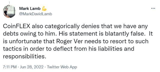 마크 램(Mark Lamb) 코인플렉스(CoinFLEX) 최고경영자(CEO)가 28일(현지시간) 자신의 트위터를 통해 "유명 가상자산(암호화폐) 투자자 로저 버(Roger Ver)가 거래소에 4700만USD코인(USDC)의 채무를 지고 있다"고 말했다.
