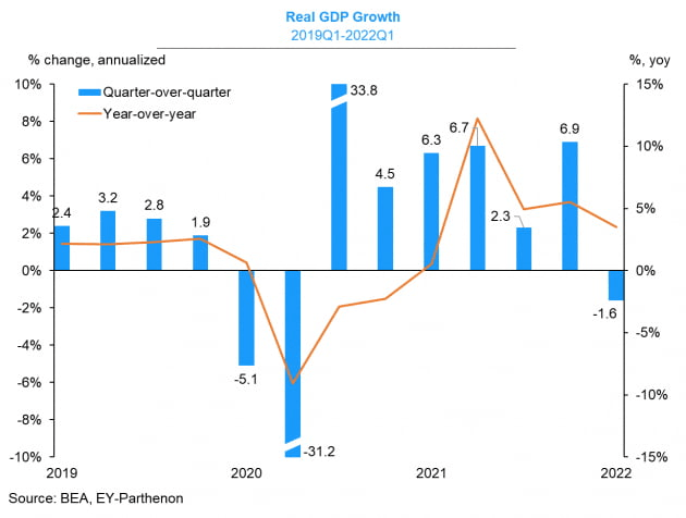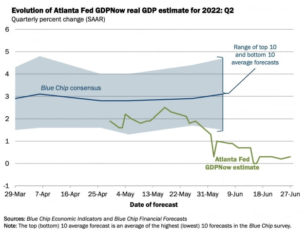 1분기 마이너스 성장은 확정됐고, 최근 부진한 경제 지표가 쏟아지면서 2분기 성장세도 그리 강하지 않은 것으로 관측되고 있습니다. 애틀랜타 연방은행이 실시간으로 집계하는 GDP나우는 27일 기준 2분기 성장률을 연율 0.3%로 추정하고 있습니다. 마이너스 성장은 아니지만, 경기가 그리 좋은 것은 아니죠. 데이터트랙 리서치는 "지난 1년 동안 GDP나우 추정치와 실제 GDP 수치는 평균 0.1%포인트 차이밖에 없었다"라고 밝혔습니다.