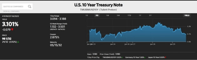 Fed 등 중앙은행의 매파적 발언에 국제 유가 등 원자재 가격이 하락하고 시장 금리는 내렸지만, 주가는 상승하는 데 실패했습니다. 서부텍사스산원유(WTI) 가격은 전장보다 1.98달러(1.77%) 하락한 배럴당 109.78달러에 거래를 마쳤습니다. 미 국채 10년물 금리는 오후 4시 20분께 전장보다 7.9bp 내린 3.101%에 거래됐습니다. 침체 우려에도 불구하고 Fed가 금리 인상을 지속할 것이란 관측이 강해진 데 따른 것입니다.