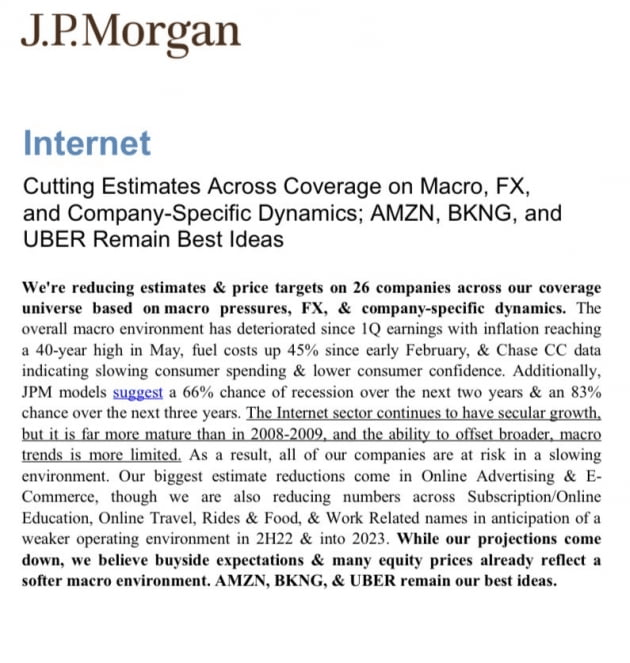 JP모건은 어젯밤 인터넷 업종 보고서에서 "거시경제적 압박과 달러 강세, 기업별 이슈에 의거해 인터넷 업종 26개 주식의 실적 전망치 및 목표 주가를 모두 하향 조정한다"라고 발표했습니다. 1분기 어닝시즌 이후에 전반적 거시적 환경이 악화하였다는 것입니다. "인플레이션은 지난 5월 40년 내 최고치에 달했고 유가는 2월 초부터 45% 상승했으며, 체이스 신용카드 사용정보에 따르면 소비자들의 지출과 자신감이 감소하고 있다"라면서 "우리 모델에 따르면 경기 침체 가능성이 향후 2년 동안 66%, 향후 3년 동안 83%에 달한다"라고 밝혔습니다.