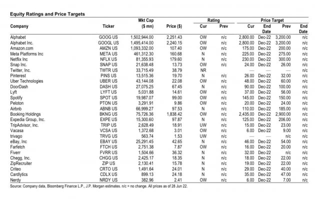 JP모건은 "인터넷 업종은 구조적 성장을 지속할 것이고, 2008~2009년 금융위기 때보다 훨씬 더 성숙했기 때문에 거시 경제 위기를 견뎌낼 능력이 있다"라면서도 "온라인 광고와 전자상거래, 구독모델과 온라인 교육 등은 둔화하는 경기 탓에 위험에 처해있다"라고 지적했습니다. 그러면서 "우리는 추정치를 낮추지만 많은 주가는 이미 이런 거시 경제 변화를 반영하고 있다고 믿는다"라면서 "아마존과 부킹닷컴, 우버는 우리의 최선호 주식으로 남아있다"라고 덧붙였습니다.