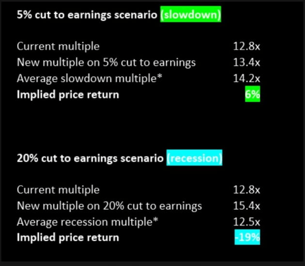 앞으로 증시는 어떻게 움직일까요. 2분기 어닝시즌을 앞두고 시장에서는 실적 둔화에 대한 걱정이 큽니다. 번스타인은 경기가 둔화하는 수준에 그치면 기업 이익이 5% 정도 깎일 것이고, 이는 주가가 지금 수준에서 5% 상승할 수 있다고 밝혔습니다. 반면 경기 침체가 구체화한다면 기업 이익 추정치가 20% 정도 하락하면서 주가는 지금보다 19% 더 떨어질 수 있다고 봤습니다.