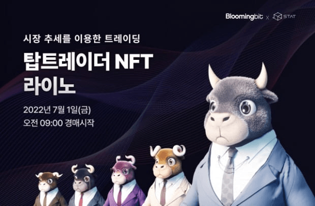 탑트레이더는 블루밍비트 소속으로 NFT를 발행한다. 해당 NFT는 오는 7월 1일 오전 9시부터 블루밍비트 내 경매를 통해 얻을 수 있다. 경매는 블루밍비트 앱에서 카카오톡 클립(Klip) 지갑을 연결한 뒤, 클립에 예치된 클레이(KLAY)를 이용해 입찰 가능하다. 탑트레이더NFT의 경매 시작가는 1000KLAY다.