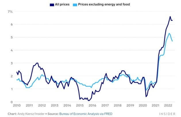 앞서 미 상무부는 5월 개인소비지출(PCE) 가격지수가 전년 동기 대비 6.3%, 전달 대비 0.6% 각각 상승했다고 밝혔다. 시장 예상치(6.4%)를 살짝 하회했다. 변동성이 큰 에너지와 식료품을 제외한 근원 PCE 물가는 전년 동기보다 4.7%, 전달보다 0.3% 각각 오른 것으로 집계됐다.