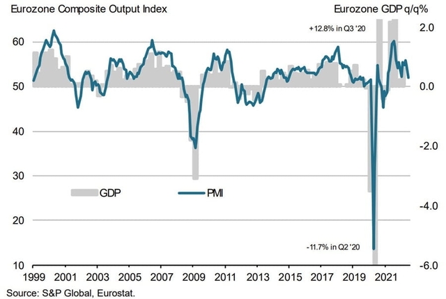 6월 유로존 S&P글로벌 서비스 PMI는 53.0으로 예상치 52.8을 넘어섰지만 전달 56.1과 비교해 낙폭이 컸다. S&P 글로벌 서비스의 이코노미스트 크리스 윌리엄슨은 "6월 수치는 유럽의 경기침체 우려를 더욱 높혔다"면서 "지금 속도라면 유로존은 올해 3분기부터 경기침체에 진입할 것"이라고 분석했다.