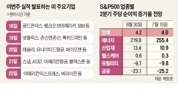 2분기 실적에 대한 우려는 점점 더 커지고 있다. 금융정보업체 팩트셋은 에너지 업종을 제외한 S&P500 기업의 2분기 순이익 추정치를 점차 낮추고 있다. 15일 기준 팩트셋은 S&P500 기업의 2분기 순이익이 전년 동기 대비 4.0% 증가한 것으로 추정했다. 지난달 말 추정치(4.2%)보다 낮췄다. 산업 섹터 순이익 증가율 추정치는 같은 기간 13.4%에서 10.9%로, 금융주는 -23.1%에서 -25.2%로 각각 하향 조정했다.