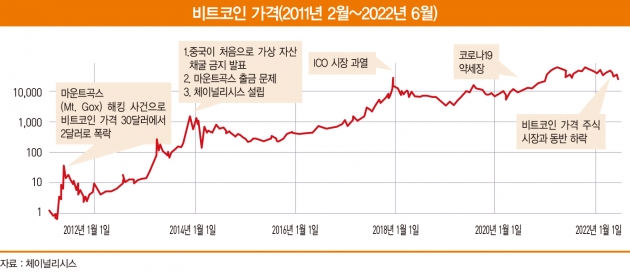 비트코인 시장이 태동하고 비트코인 가격이 30달러에 다다른 2011년 마운트곡스(Mt. Gox) 시스템이 해킹돼 비트코인 가격이 2달러로 하락했고 2013년 이후 은행과 도소매 업체의 암호화폐 결제와 채굴을 중국이 금지한 이후에도 마운트곡스의 출금 문제로 불안감을 느낀 투자자들의 인출로 또 다른 하락으로 이어졌다.