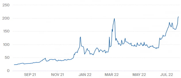유럽 천연가스 가격 고공행진이 계속되고 있다. 유럽 천연가스 가격이 MWh(메가와트시) 당 200유로를 돌파하며 연중 최고가를 새로 썼다.