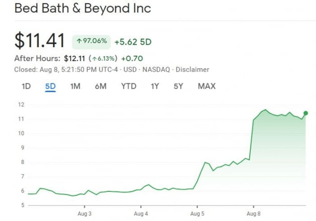이날 시장 특징 중 하나는 AMC, 게임스톱, 베드배스앤드비욘드 등 밈주식이 폭등했다는 것입니다. 베드배스앤드비욘드의 주가는 39.83% 치솟았습니다. 거래량도 1억2050만 주로 사상 최대를 기록했습니다. 30일 평균 1426만 주를 9배가량 웃도는 수치입니다. 지난 5일간 97% 올랐습니다. AMC도 지난 5일 18% 상승에 이어 이날 8% 이상 올랐고 게임스톱도 마찬가지였습니다. 이는 개인 투자자가 이번 랠리를 주도하고 있다는 증거로 여겨지고 있습니다. 빅테크를 밀어 올리던 개인들이 빅테크 상승세가 주춤하자 밈주식으로 다시 몰리고 있다는 것이죠. 월가 관계자는 "수요일 7월 소비자물가(CPI) 발표를 앞두고 관망세가 짙어지면서 시장에 약간의 힘의 공백 상태가 발생했다. 그 와중에 활발한 종목 장세가 펼쳐 졌다"라고 설명했습니다.
