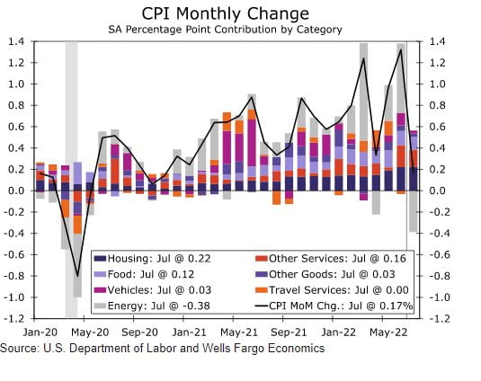 "7월 CPI 둔화는 주로 에너지 가격 하락에 기인할 것이다. 인플레의 모멘텀을 통제하기가 어렵다는 점은 근원 물가가 7월에 지난해보다 최대 6.2%까지 상승하고 3분기까지 계속 올라갈 것으로 예상된다는 점에서 다시 한번 상기시켜줄 것이다. 소비자 지출이 서비스로 옮겨가고 공급망 혼란이 완화되면서 일반적으로 상품에서 물가 압력은 완화되고 있지만, 서비스 인플레이션은 둔화할 조짐이 거의 없다. 임대료 상승은 냉각되기 시작했지만, 주거비는 향후 몇 개월 동안 더욱 강력한 상승세를 보일 것이다. 더 넓은 인건비는 계속해서 높은 속도로 오르고 있다. 물가 하락은 분명히 환영할 일이지만 인플레이션을 Fed가 목표에서 아주 멀 뿐 아니라 이를 낮추기 위한 상당한 작업이 남아 있다. 결론적으로 인플레이션이 지속해서 연준의 목표치를 향해 되돌아가고 있다는 '강력한 증거'는 몇 달 후에 나올 가능성이 크다."