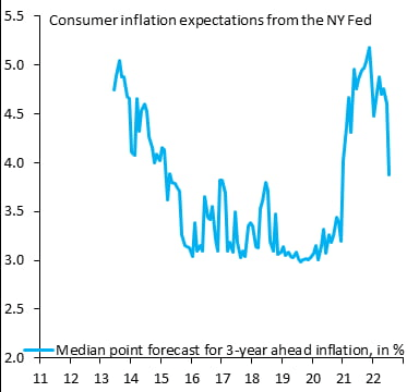 이날 인플레이션 하락에 대한 기대가 또다시 커졌습니다. 뉴욕 연방은행의 소비자 기대 조사(Survey of Consumer Expectations)에서 7월 기대인플레이션이 큰 폭으로 낮아진 것입니다. 향후 1년 기대 인플레이션은 6월 6.8%에서 7월 6.2%로 떨어졌습니다. 또 3년 기대 인플레이션도 6월 3.6%에서 3.2%로 감소했고, 5년 인플레이션 전망 또한 2.8%에서 2.3%로 하락했습니다. 식료품 휘발유 등 생활필수품의 폭등세도 잦아들 것이라는 전망이 대다수였습니다.