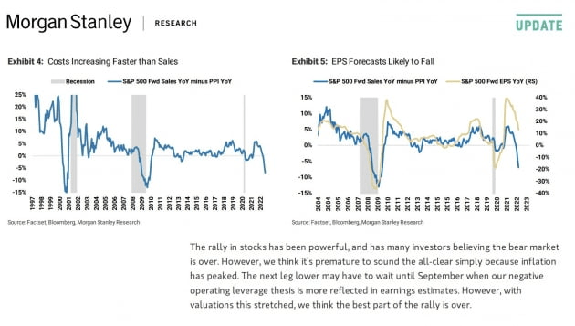 모건스탠리의 마이크 윌슨 최고투자책임자는 "최종 소비자에 대한 가격은 여전히 빠른 속도로 오르고 있지만, 생산자를 위한 가격은 두 배 빠른 속도로 상승하고 있다"라면서 "2023년까지 기업 마진 확대가 이어질 것이라는 월가 애널리스트의 기대는 고착되어가고 있는 비용 압박과 수요 감소로 인해 비현실적"이라고 주장했습니다. 그는 인플레이션이 정점에 이르렀을 수 있음을 인정합니다. 하지만 "인플레이션이 정점에 이르렀기 때문에 모든 것이 명확해졌다고 보는 건 시기상조"라며 "9월이 되면 영업 레버리지의 마이너스 영향이 이익 추정에 더 많이 반영되면서 또 다른 하락이 나타날 수 있다"라고 밝혔습니다. 윌슨은 ”밸류에이션이 확장되면서 랠리의 가장 좋은 부분은 끝났다고 생각한다”고 덧붙였습니다.