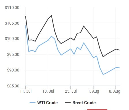 9일(현지시간) 뉴욕상업거래소에서 9월물 서부텍사스산원유(WTI) 가격은 전날보다 26센트(0.29%) 하락한 배럴당 90.50달러에 거래를 마쳤다. 런던 ICE선물거래소에서 영국 브렌트유 10월물 가격은 전날보다 34센트(0.35%) 내린 배럴당 96.31달러에 마감했다.