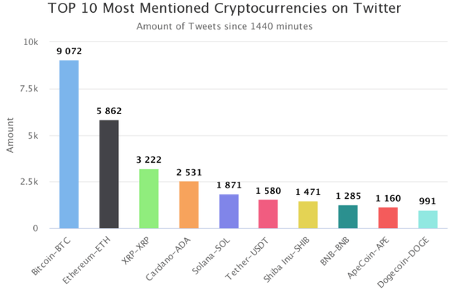 4위~10위에는 카르다노(ADA, 2531회), 솔라나(SOL, 1871회), 테더(USDT, 1580회), 시바이누(SHIB, 1471회), 바이낸스코인(BNB, 1285회), 에이프코인(APE, 1160회), 도지코인(DOGE, 991회) 등이 이름을 올렸다.