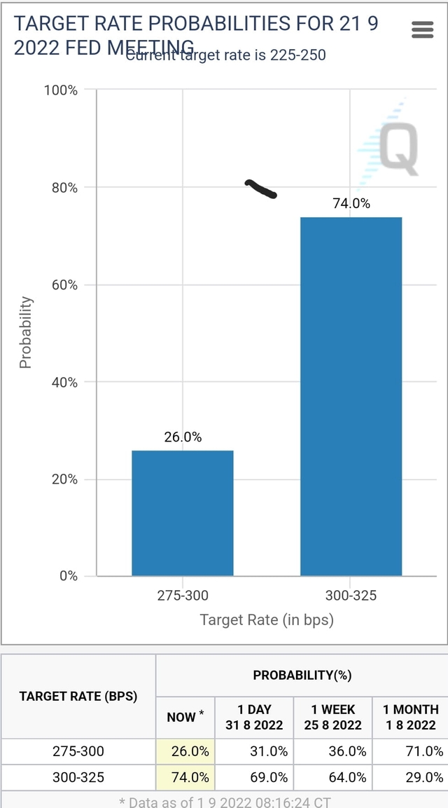 달러인덱스가 109선을 넘어선 것도 살펴볼 부분입니다. 현재 109.2선에서 움직이고 있죠. 미국 10년물 국채수익률은 하루사이에 11bp 뛰면서 현재 연 3.249%까지 올랐고, 통화정책에 민감하게 움직이는 2년물은 연 3.5%를 넘어섰습니다. 관련해서 함께 보실 만한 데이터는 연방기금금리 선물 시장 흐름을 기반으로 미국 기준금리 인상폭들의 확률을 보여주는 fedwatch 데이터입니다. 한 달 전까지만 해도 9월 기준금리 50bp 인상확률이 71%였는데, 이제는 75bp 인상확률이 74%까지 뛰어올랐습니다.