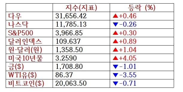 채권 금리도 치솟으며 주가에 부정적인 영향을 미쳤다. 이날 미국의 2년물 국채 금리는 장중 3.52%대로 오르면서 2007년 이후 15년 만에 최고치를 경신했다. 10년물 국채 금리도 3.26%까지 오르며 지난 6월 이후 최고치를 기록했다.