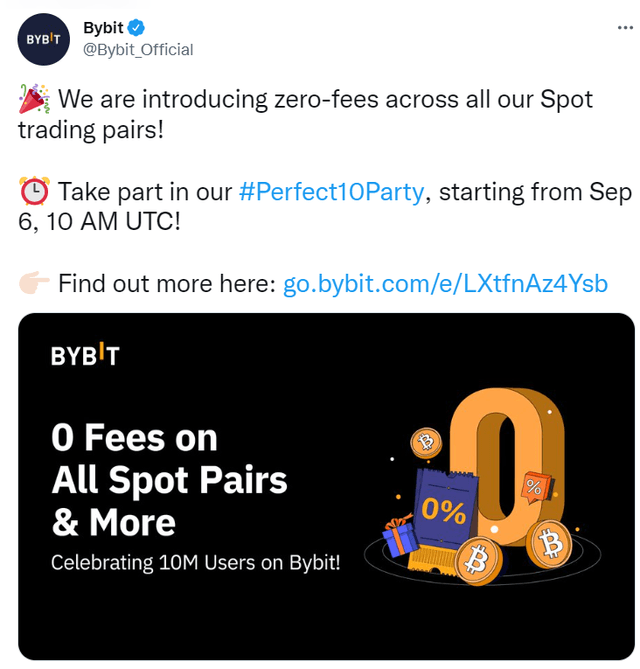 글로벌 가상자산(암호화폐) 거래소 바이비트가 2일(현지시간) 공식 사이트를 통해 9월 6일 오후 7시(한국시간)부터 사용자 수 1000만명 돌파를 기념하기 위해 거래소 내 모든 현물 거래 페어의 거래 수수료를 면제한다고 공지했다.