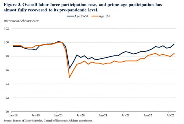 임금 상승률, 노동시장 참여율도 시장을 흡족하게 했다. 시간당 평균 임금은 전월 대비 0.3% 증가했다. 이는 전월의 0.5% 상승, 예상치 0.4% 상승보다 낮은 것이다. 전년 대비로는 5.2% 늘어 전달과 같았다. 노동시장 참여율은 62.4%로 전달보다 0.3%포인트나 증가했다. 이는 팬데믹 이후 최고 수준이다. 특히 노동 적령기인 25~54세 미국인의 노동시장 참여율은 82.8%로 나타나 전월보다 0.4%포인트나 높아졌다. 팬데믹 이전인 2019년 4분기 수준과 비슷하다. 이렇게 노동시장 참여자가 늘어나면 고용이 늘어나도 임금 상승 압박은 낮아지게 된다.
