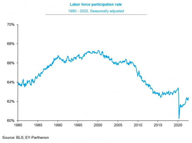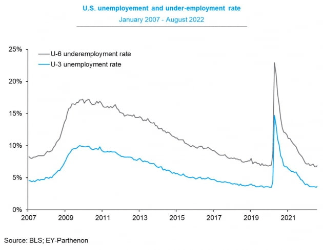8월 노동시장 참여율은 62.4%로 전달보다 0.3%포인트나 증가했습니다. 팬데믹 이후 최고 수준입니다. 특히 노동 적령기인 25~54세 미국인의 노동시장 참여율은 82.8%로 나타나 전월보다 0.4%포인트 높아졌습니다. 팬데믹 이전인 2019년 4분기 수준과 비슷합니다. 이렇게 노동시장에 새로 진입하는 사람이 많이 늘어나는 바람에 신규고용이 30만 개 이상 증가했지만, 실업률도 올라간 것입니다. 즉 노동 공급의 확대라는 맥락에서 나쁘지 않은 수치입니다. 게다가 Fed는 뜨거운 노동시장을 식히겠다며 강하게 긴축하고 있습니다. 실업률 상승은 그런 Fed가 좋아할 만한 것입니다.