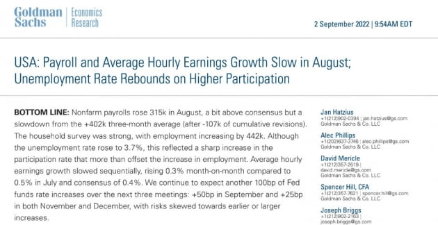 뱅크오브아메리카는 "Fed가 9월과 11월에 각각 50bp를 인상할 것으로 본다. 노동 공급의 증가가 9월부터 시작되는 더 느린 속도의 긴축의 문을 열어준다. 8월 고용보고서에는 Fed를 위한 좋은 소식이 충분히 담겨 있다"라고 밝혔습니다. 골드만삭스도 "우리는 지속해서 Fed가 올해 말까지 100bp를 올릴 것으로 예상한다"라며 "9월에 50bp, 11월과 12월에 각각 25bp를 인상할 것으로 보지만 위험은 여전히 조기 인상 혹은 더 큰 폭의 인상으로 치우쳐 있다"라고 밝혔습니다.
