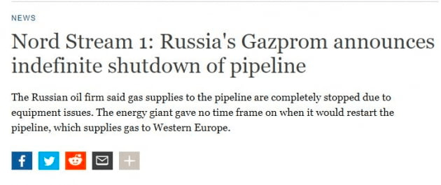 50bp 인상 기대에 찬물을 부은 탓인지 주가는 비틀대더니 오후 12시가 넘자 하락하기 시작했습니다. 하필 그럴 때 긴급 뉴스가 전해졌습니다. 12시 15분께 러시아가 독일로 연결되는 가스관 '노르트스트림-1'에서 돌연 문제가 발견됐다며 가스 공급 중단을 통보했다는 뉴스가 나온 것입니다. 지난 사흘간 정비를 한다며 가스 공급을 멈췄던 러시아 국영 가스회사 가스프롬은 3일 공급을 재개할 예정이었습니다. 그런데 갑자기 "정기 점검 중 기름 누출이 발견됐다"라며 문제가 해결될 때까지 무기한 공급이 중단될 것이라고 발표한 것입니다. 러시아는 이미 가스 공급량을 용량의 40%에서 20%로 낮추면서 유럽의 목을 졸라 왔는데, 여름이 끝나고 날씨가 서늘해지자 이제 아예 끊을 판입니다.