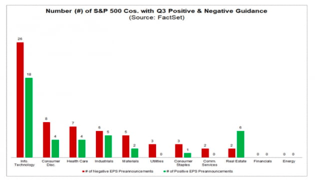 다음 주 월가에서는 여러 개의 투자 콘퍼런스가 열립니다. 주요 기업들이 참가해 올해 실적 전망치에 대해 언급할 것입니다. 지금 같은 상황에선 실망스러운 가이던스를 내놓는 곳이 있을 겁니다. 팩트셋에 따르면 월가 애널리스트들은 7~8월 두 달간 S&P500 기업들의 3분기 주당순이익(EPS) 전망치를 5.4%(59.44달러→56.21달러) 낮췄습니다. 이는 지난 5년(20개 분기) 평균인 1.9%의 두 배가 넘습니다. 지난 10년간을 따져도 2.7%입니다. S&P500 11개 업종 가운데 9개의 전망치가 낮아졌고 통신서비스(-12.8%) 정보기술(-9.1%) 등 기술주 업종이 가장 많이 떨어졌습니다. 같은 기간 4분기 EPS 추정치도 3.5%(60.73달러→58.60달러) 하락했습니다.