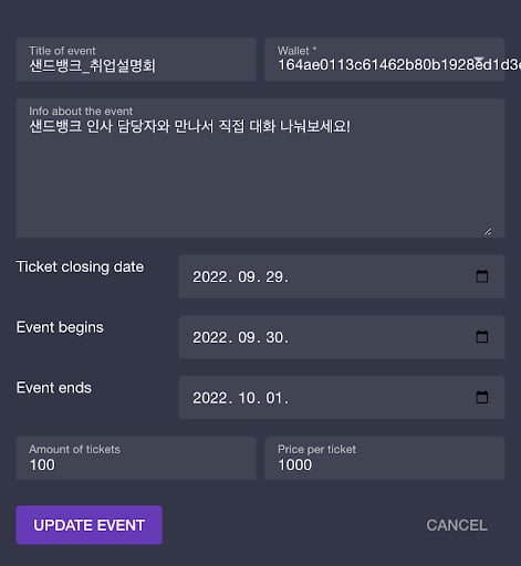 방법은 간단하다. LNbits의 ‘Events’ 메뉴에서 ‘새로운 이벤트 만들기’ 버튼을 누르면 입장권에 대한 상세정보를 입력할 수 있다. 필자는 이벤트 이름을 ‘샌드뱅크 취업설명회'로 입력하고, 입장권은 9월 29일까지만 판매, 이벤트는 9월 30일부터 10월 1일까지 이틀 동안만 열리는 것으로 설정했다. 총 몇 장의 입장권을 발행할 것인지, 그리고 입장권 가격은 장당 얼마인지도 설정할 수 있다.