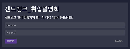 상세내역을 입력한 후 하단의 ‘이벤트 생성' 버튼을 누르면 샌드뱅크 취업설명회에 참석할 구직자가 티켓을 구입할 수 있는 웹사이트 링크가 생성된다. 이벤트에 참여하고 싶은 사람은 이 링크에 접속하여 이름과 이메일 주소를 적고 QR 코드를 통해 비트코인으로 티켓 비용을 납부할 수 있다. 참고로 필자가 사전에 설정한 티켓 가격은 1000 sats 이다 (약 273원).