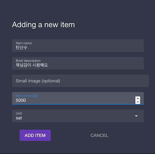 행사장 주변에서 이벤트나 전시를 여는것 외에도 자기가 만든 물건을 팔고싶은 사람도 있을 것이다. 필자는 작은 트럭을 빌려 커피나 레모네이드를 만들어 팔면서 자사 브랜드를 홍보하는 기업도 본 적이 있다. 만약 이렇게 오프라인에서 물건을 팔고 댓가로 비트코인을 받고 싶다면 LNbits의 ‘오프라인 샵' 기능을 이용하면 좋다. 이 기능은 판매자가 포스기나 신용카드 단말기가 없어도 쉽게 오프라인 매장을 열 수 있게 해준다. 심지어 판매할 물건에 가격표가 붙어있지 않아도 괜찮다. 필자는 탄산수를 판매목록에 추가해봤다. 판매할 제품명과 간단한 설명, 제품 이미지를 첨가할 수 있다. 개당 가격은 5000 sats (약 1367원)로 정해봤다.