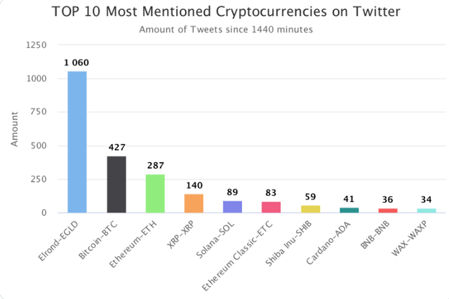 6일 가상자산(암호화폐) 마켓 데이터 플랫폼 코인트렌즈닷컴(CoinTrendz.com)에 따르면 이날 오전 04시 기준 1시간 동안 트위터에서 가장 많이 언급된 가상자산은 엘론드(EGLD, 1060회)로 나타났다.