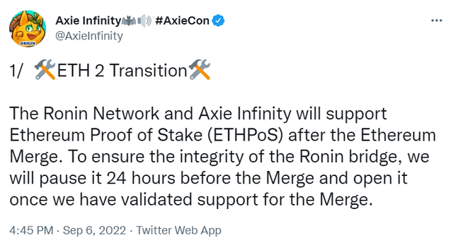 엑시인피니티(AXS)와 이더리움(ETH) 사이드체인 로닌네트워크(RON)가 이더리움 머지(PoS 전환)를 지원할 계획인 것으로 나타났다.